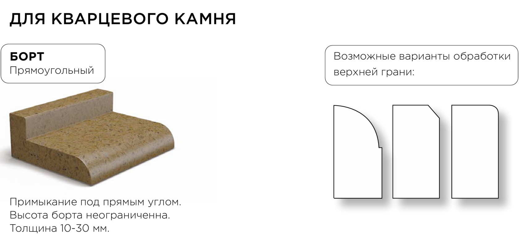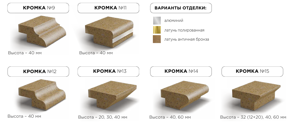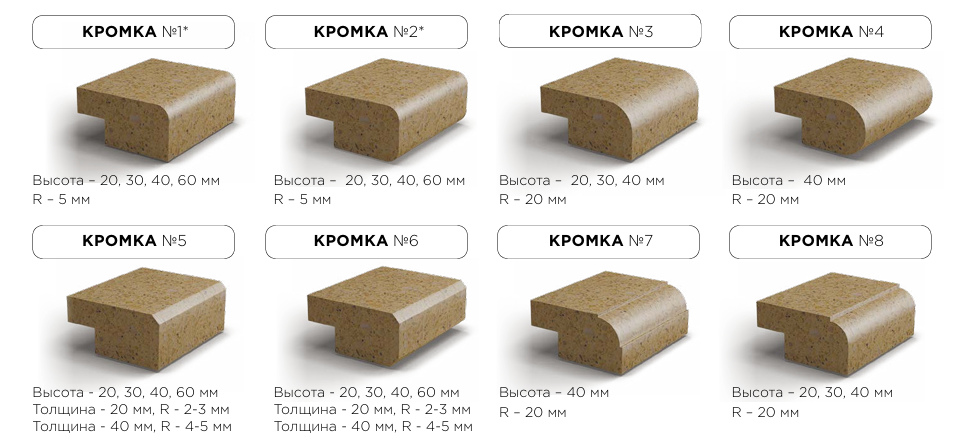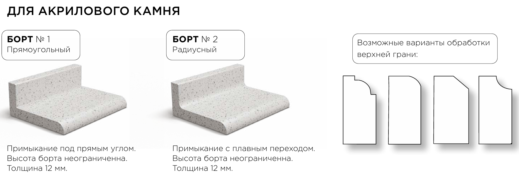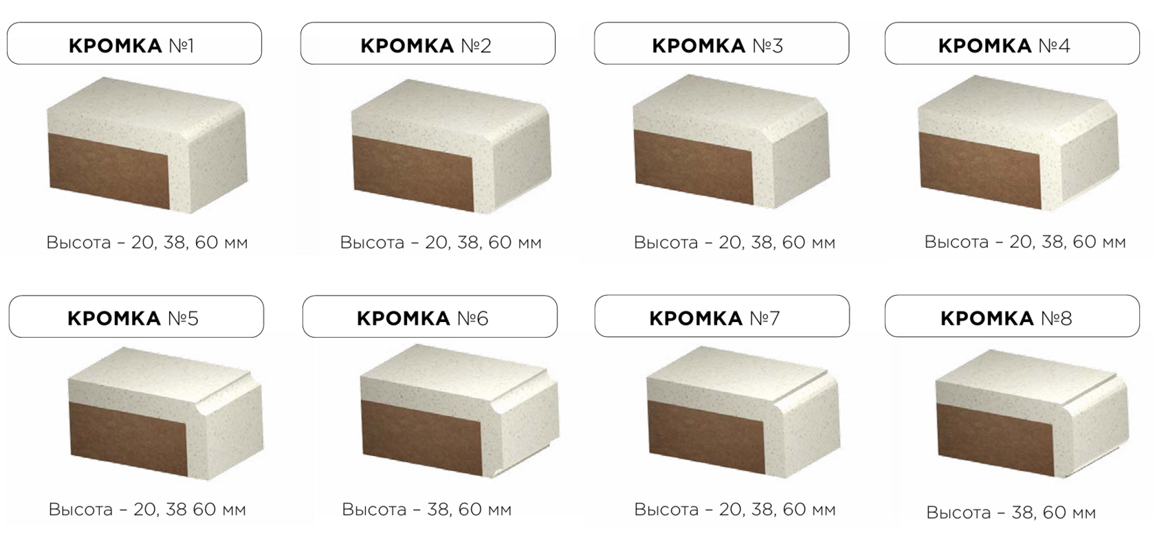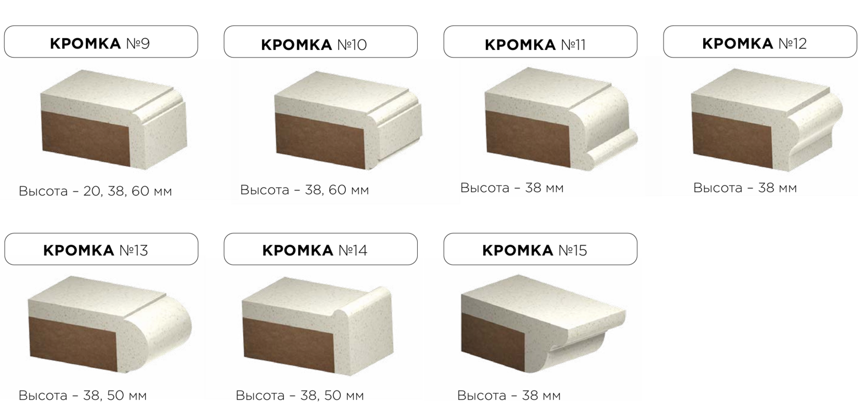 В дизайне не бывает мелочей. Кромка, борт, фаска — незначительные, на первый взгляд, детали. Но подойдите к ним с фантазией — и Вы получите эксклюзивный результат. Столешница из искусственного камня — сама по себе украшение любой кухни. Добавьте к ней борт и оригинальную кромку, и ваша столешница станет королевой интерьера. В нашем каталоге вы обязательно найдете именно тот профиль кромки, который подчеркнет стиль Вашего интерьера. Такого разнообразия Вы больше нигде не найдете. Наши мастера постарались именно для Вас!