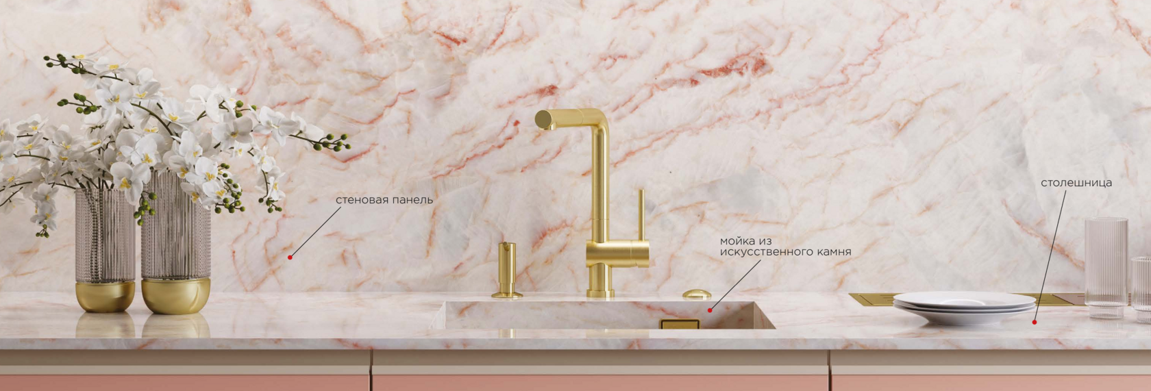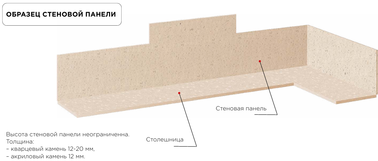 Искусственный камень — великолепный материал для стеновых панелей. Сегодня это модно, стильно и очень практично! Панели из искусственного камня не только красивы, они экологичны, долговечны, просты в уходе. Мы можем изготовить панели из любой коллекции искусственного камня. Они имеют различную фактуру, цвет, оттенок, рисунок вкраплений. Широкая цветовая гамма, от светлых, спокойных пастельных тонов до дерзко ярких, насыщенных — богатый материал для творчества и создания разнообразных стилей. Стеновая панель смотрится очень органично, если она сделана из того же камня, что и столешница. А можно наоборот, сыграть на контрастах и добиться необычных цветовых эффектов! Строгий минимализм, природная естественность, изысканная элегантность или ослепительная роскошь — что бы вы ни выбрали, мы готовы воплотить ваши идеи. Не бойтесь экспериментировать, а мы поможем вам в этом.